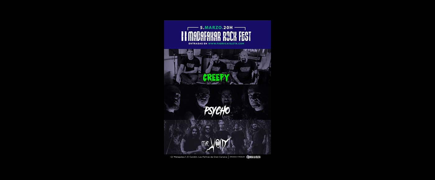 The ‘Madafakar Rock Fest’ came about at the Adrenaline Pub in Playa del Inglés on 22 February 2020. Samples of rock & heavy metal made in the bowels of Gran Canaria’s capital city, this festival is back on this occasion at the venue of ‘Fábrica La Isleta’, Fetauring performances by CREEPY, PSYCHO and, as a novelty for the second edition, THE VOID.